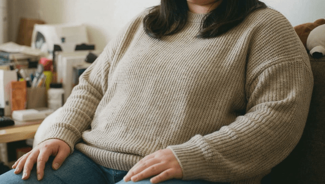 Fat woman sitting in her bedroom and touching her stomach