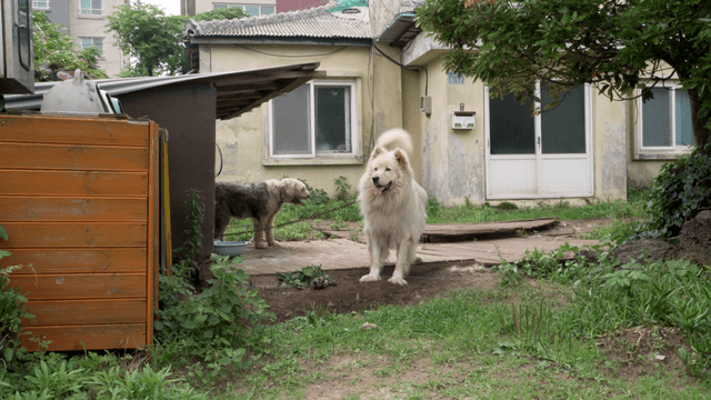 Small poodle dog resting next to crates of tomatoes in a produce warehouse