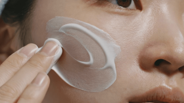 Woman gently drying her face with a towel in front of a bathroom mirror