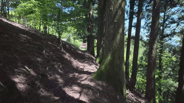 Sunlit forest path with surrounding greenery