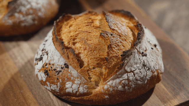 Freshly baked sourdough on wooden cutting board