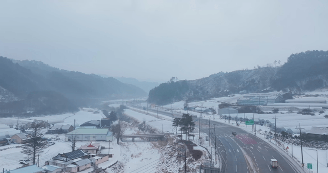 Snow-covered Hanok village by sea