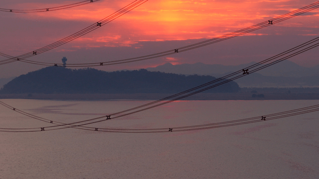 Sunset over a river with power lines