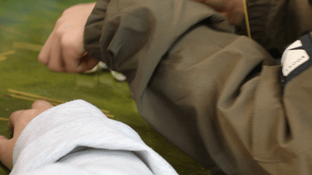 Hands creating structures with marshmallows and spaghetti noodles