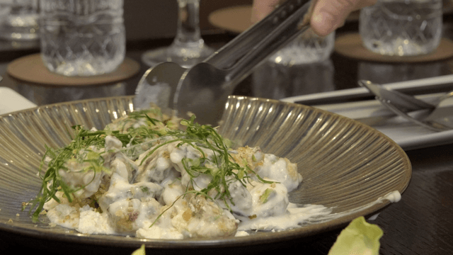 Chopsticks picking tangsuyuk with vegetable sauce on plate