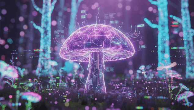 Digital mushrooms in futuristic virtual forest