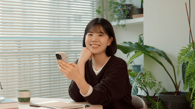 Woman smiling while holding a smartphone