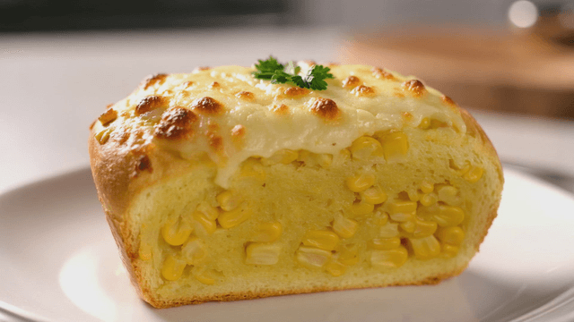Freshly baked corn bread on wooden cutting board