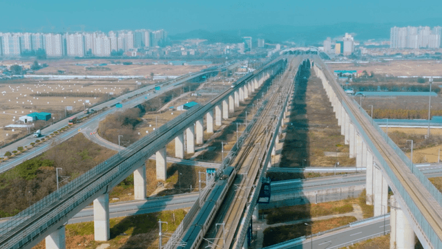 High-speed train passing through countryside, surrounded by hills and fields under a bright sky