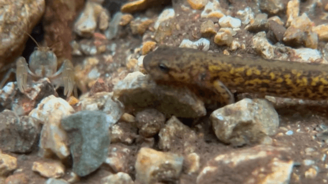 Crayfish moving among river rocks