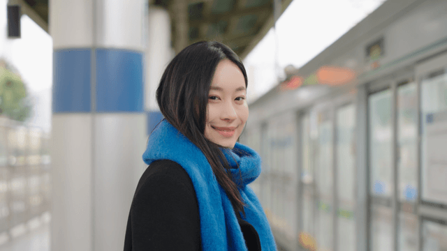 Woman smiling while waiting at a winter subway station