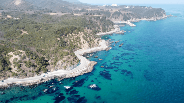 Coastal road winding along the green sea