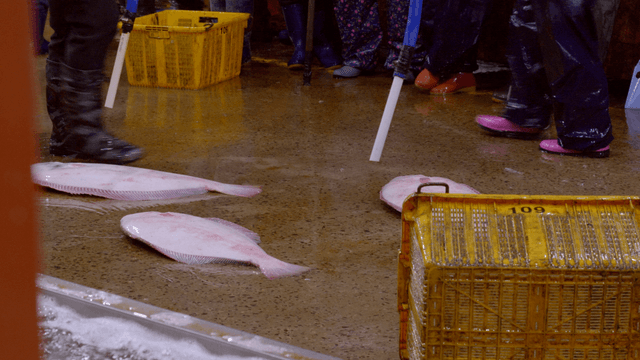 Fish being put into baskets on fish market floor