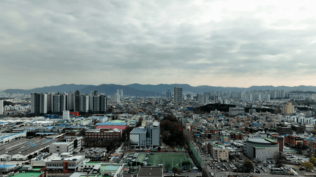 Sprawling cityscape under cloudy skies