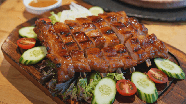 Piece of Spicy Braised Pork Galbi topped with vegetables