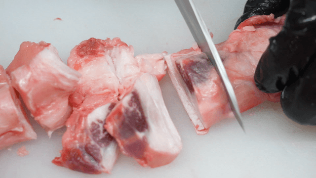 Slicing raw pork on a wooden cutting board with knife