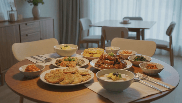 Table set with traditional Korean holiday dishes