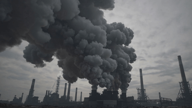 Person wearing gas mask walking against backdrop of smoke-emitting factory