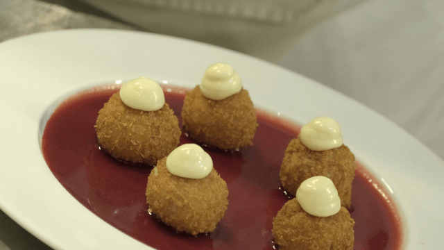 Sweet and sour pork, made by pouring sauce over crispy fried food
