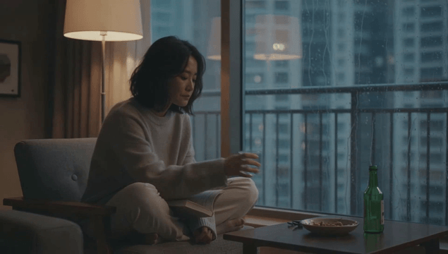 Woman sitting alone by the window on a rainy day, drinking soju.