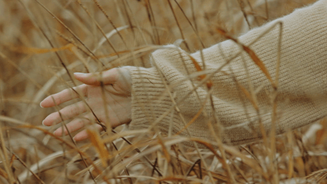 A hand gently touching wildflowers