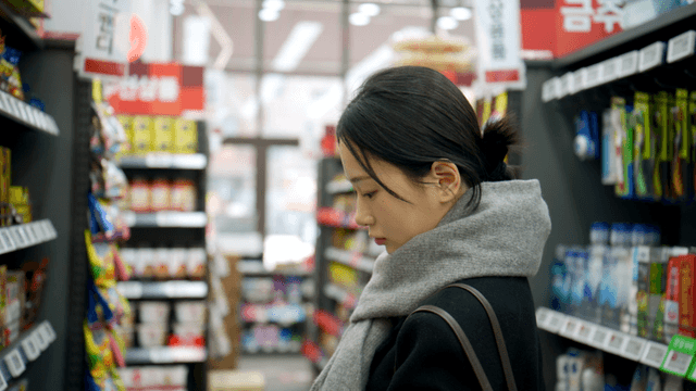 Young woman looking at food ingredient list at supermarket and putting it down.