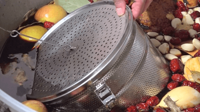 Boiling soy sauce with apples and medicinal ingredients in pot