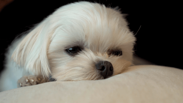 Small poodle dog resting next to crates of tomatoes in a produce warehouse