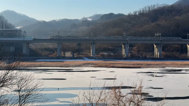 Train passing over frozen river