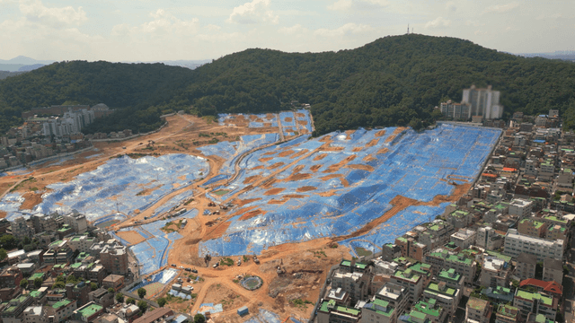 Construction site with blue tarps and hills