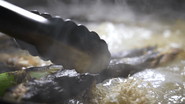 Fresh webfoot octopus being added to the boiling broth in a pot