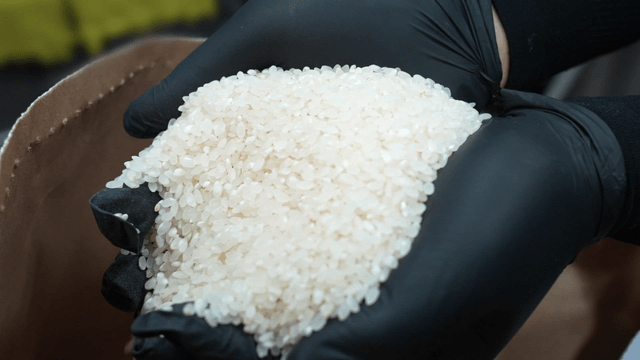 Hands wearing plastic gloves putting seasoned abalone on rice balls