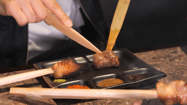 Gloved hands brushing sauce to grilled skewers in the kitchen