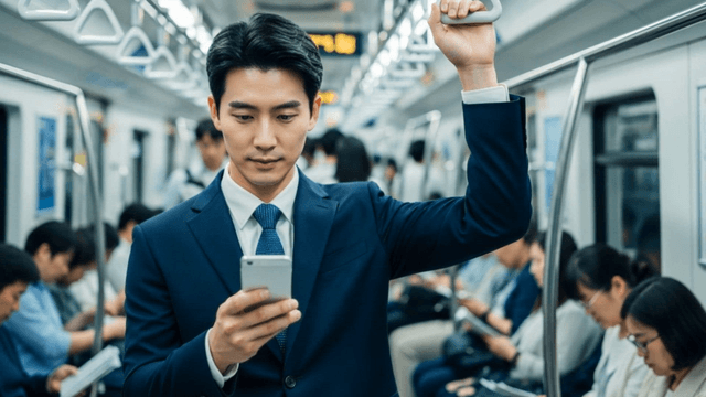 Woman smiling while looking straight ahead at her smartphone on the subway platform