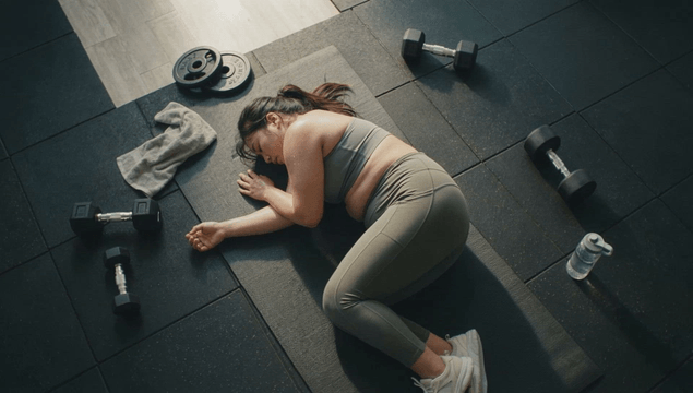 Fat woman lying on gym floor after working out