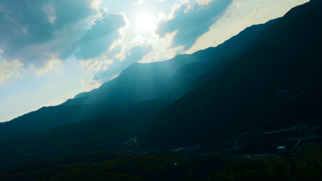 Sunlight breaking through clouds over mountains