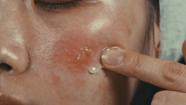 Woman gently drying her face with a towel in front of a bathroom mirror
