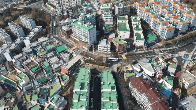 Aerial view of a dense urban neighborhood