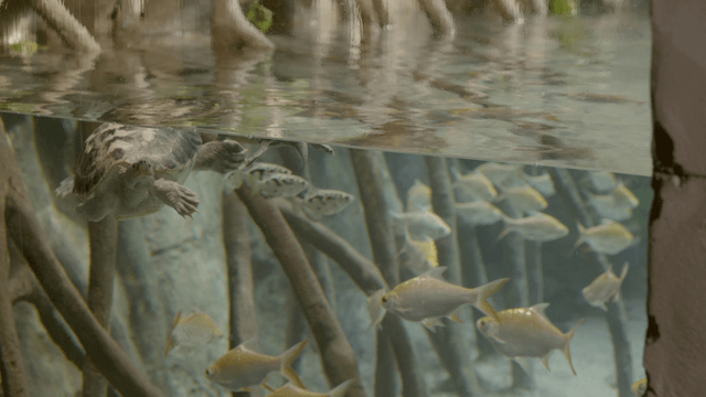 Turtle swimming in an aquarium with fish