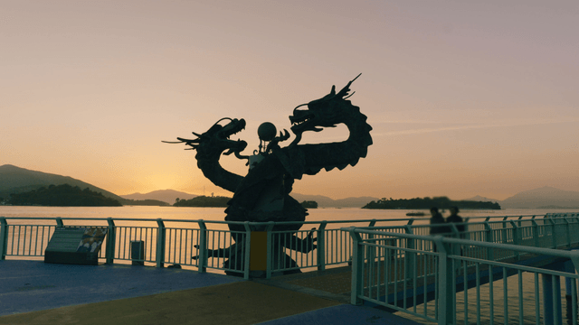 Dragon statue by the sea at sunset