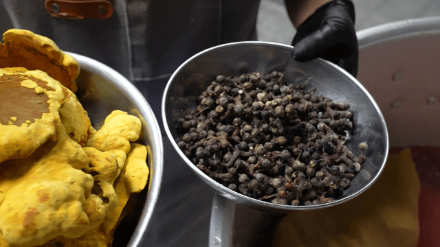 Cook holding mixed chili seasoning in large metal bowl