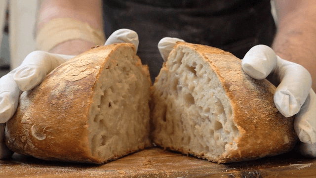 Freshly baked bread being handled