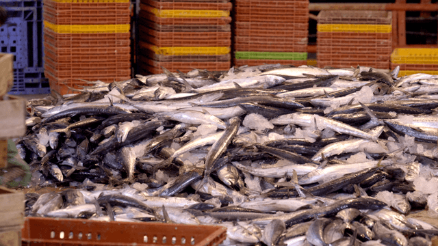Fresh fish being arranged in a green crate by a worker in a food processing factory