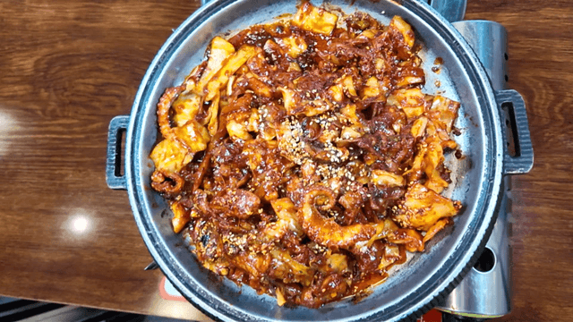 Webfoot octopus being stir-fried with spicy seasoning in a pan