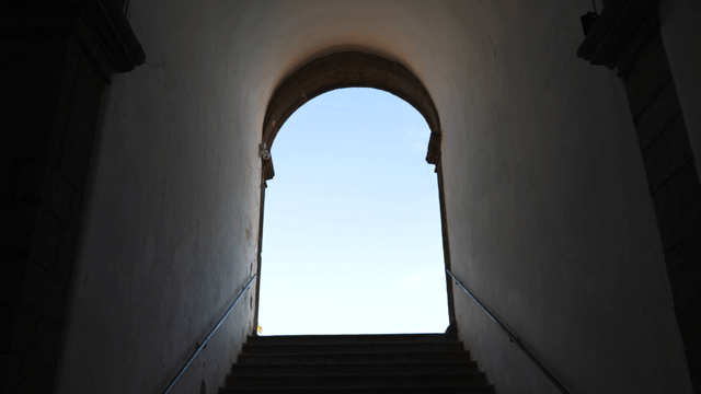 A quiet tunnel leading to outdoor stairs
