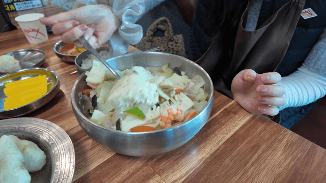 Spoon of rice mixed with fried egg and kimchi stew broth