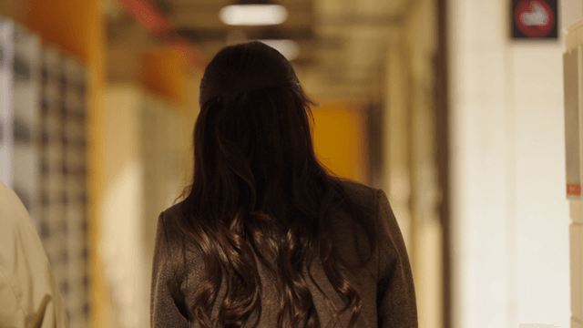 Woman walking down a dimly lit hallway
