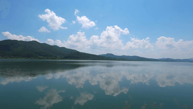 Green hills and a tranquil lake