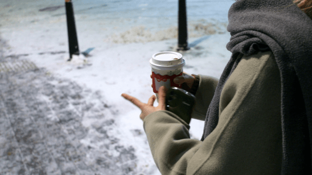 Snowy cafe window with young woman enjoying hot drink