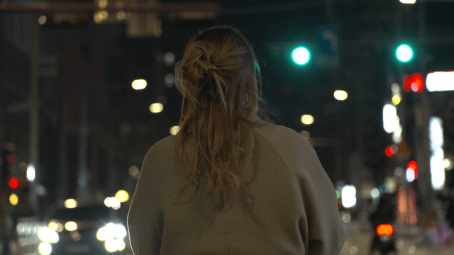 Back view of a woman walking through a city street at night